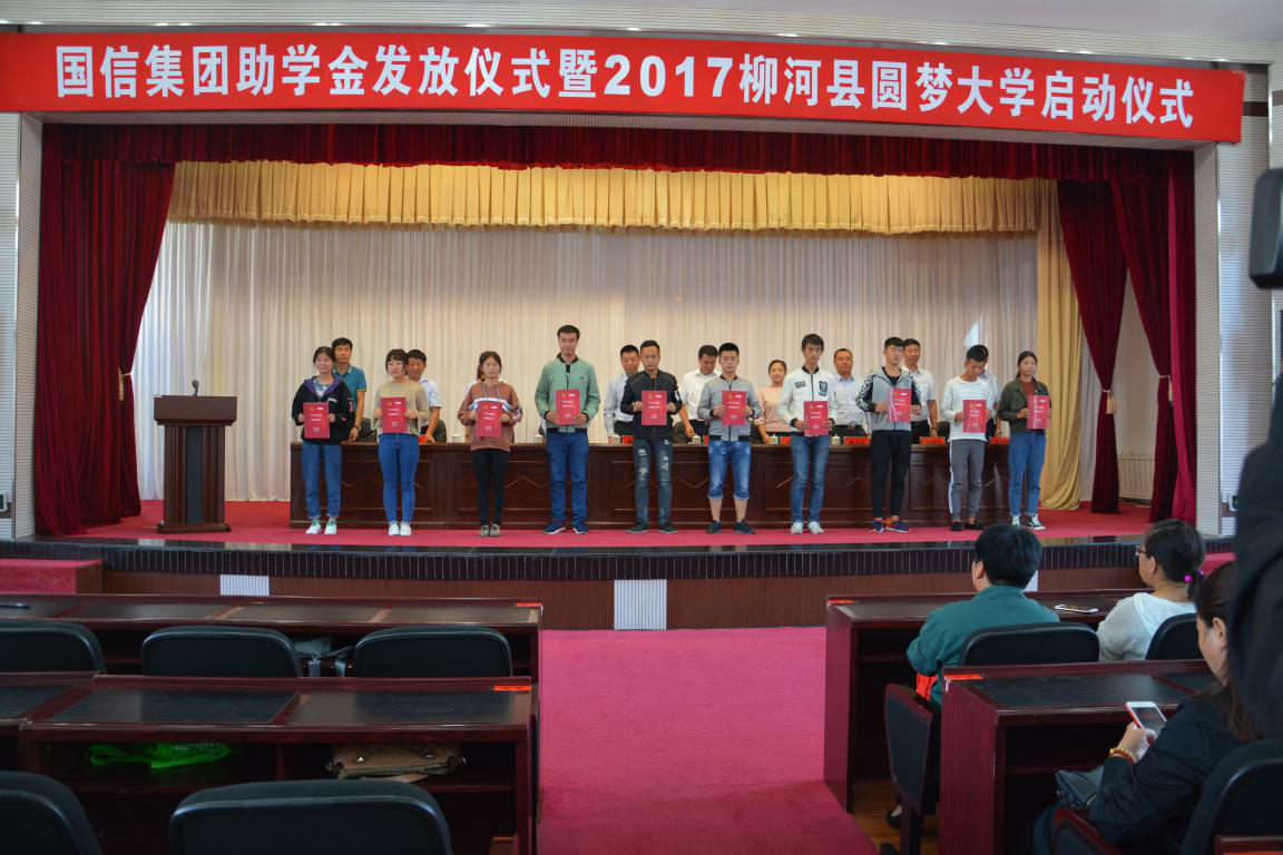 注:國(guó)信慈善基金會(huì)助學(xué)金發(fā)放儀式留影。